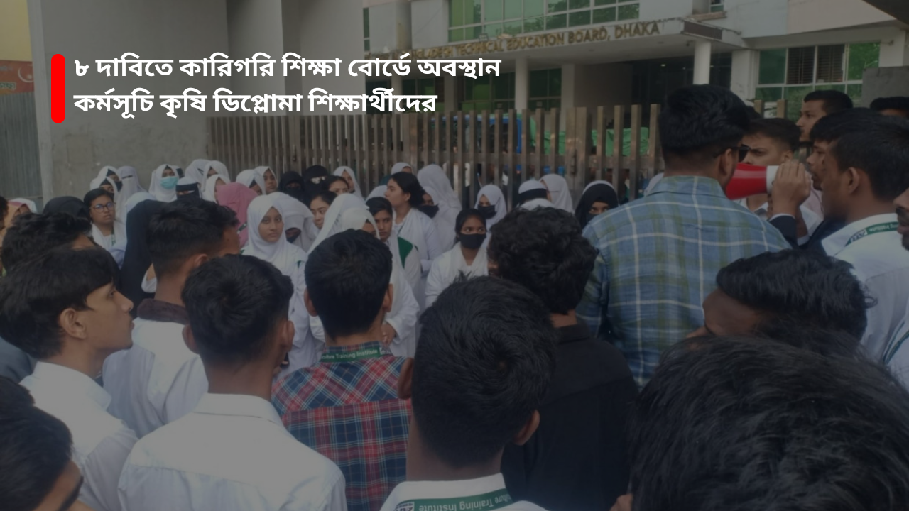 ডিপ্লোমা কৃষিবিদদের স্বতন্ত্র পাবলিক কৃষি বিশ্ববিদ্যালয়ে উচ্চ শিক্ষা গ্রহণের সুযোগসহ ৮ দফা দাবিতে অবস্থান কর্মসূচি পালন করেছে কৃষি ডিপ্লোমা শিক্ষার্থীরা। আজ রবিবার (২২ ডিসেম্বর) বেলা ১টার পরে তারা কারিগরি শিক্ষা বোর্ডের মূল ফটকের সামনে কৃষি ডিপ্লোমা ছাত্র অধিকার আন্দোলনে ঘণ্টাব্যাপী অবস্থান কর্মসূচি পালন করেন তারা। পরে বেলা দুইটার দিকে মূলফটক ছেড়ে দেন আন্দোলকারীরা। এসময় তাদের বিভিন্ন স্লোগান দিতে দেখা যায়।